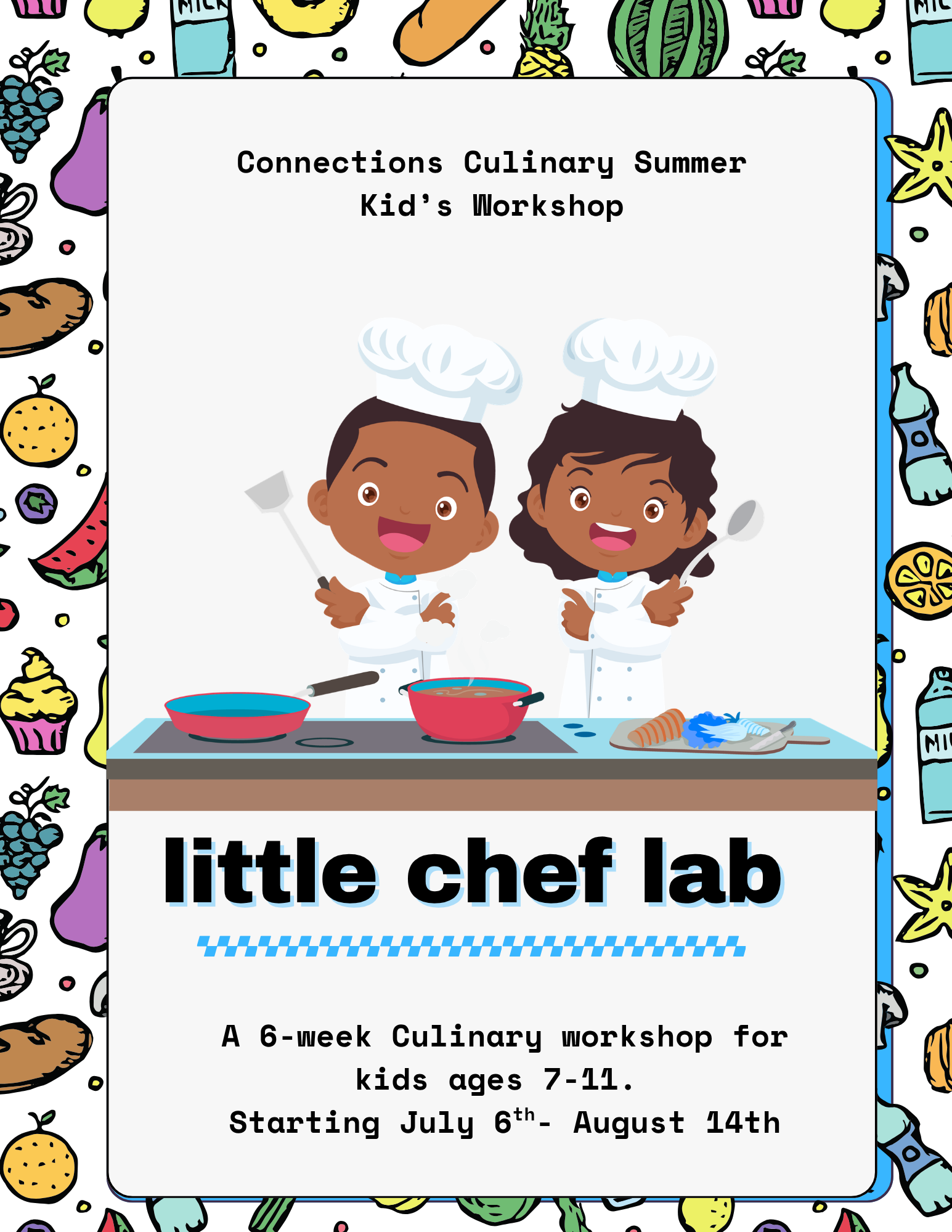 The Little Chef’s Lab is for school age children, ages 7-11. It is a six week workshop series running from July 6, 2026 - August 14th, 2026; Monday thru Friday 9:00 am-12:00 pm. The workshop is facilitated by Chef Educators in a small class setting 1:6 student or 2:12 (two professional adult instructors onsite at all times) with a maximum of 12 students per session. Enroll your child today as space is limited!